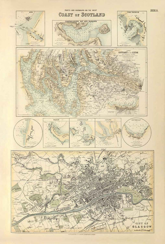 Carte ancienne des ports de la côte ouest de l'Écosse, 1872 par Fullarton: Glasgow, Largs, Portpatrick, Irvine, Ayr