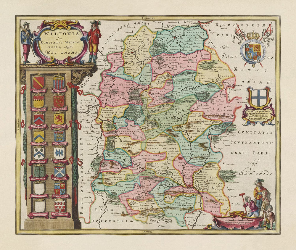 Ancienne carte de Wiltshire en 1665 par Joan Blaaueu: Salisbury, Stonehenge, Swindon, Trowbridge, Chippenham, Melksham