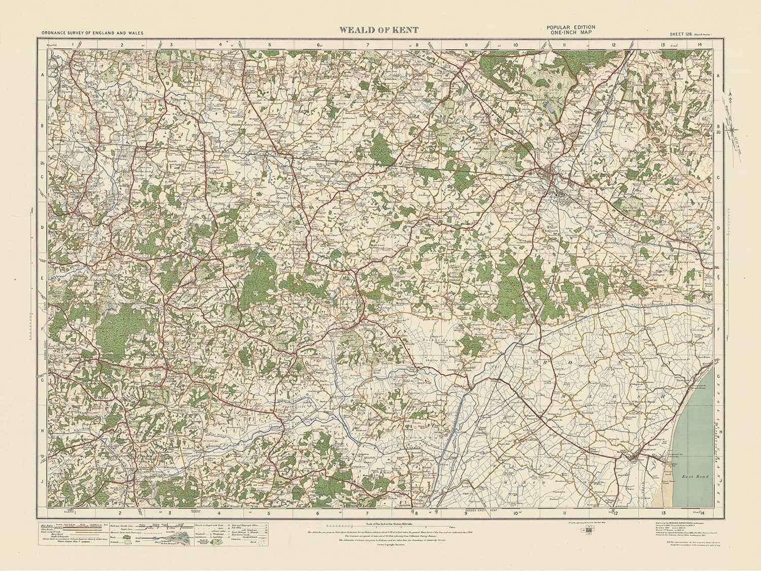 Carte Old Ordnance Survey, feuille 126: Weald of Kent, 1925 : Ashford, New Romney, Tenterden, Cranbrook, High Weald AONB