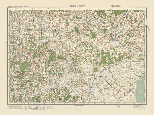 Cette carte présente le Weald of Kent, une région historique située dans le comté de Kent, en Angleterre. Elle offre une perspective unique sur le paysage, les établissements et les monuments de la région tels qu'ils existaient en 1925. Il est important de noter que même si certaines villes modernes peuvent ne pas être présentes sur cette carte, elle offre l'occasion d'explorer la région sous des formes antérieures. noms ou découvrez des villes et des villages moins connus qui ont évolué depuis.