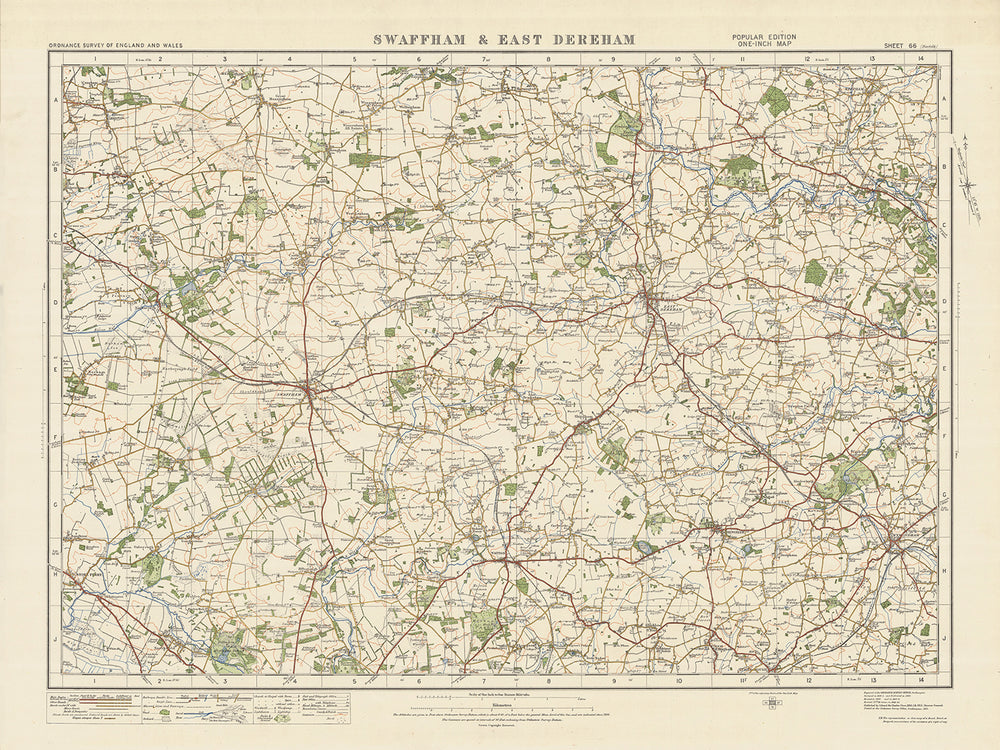Carte Old Ordnance Survey, feuille 66: Swaffam & East Dereham, 1925 : Watton, Wymondham, Attleborough, Reepham, Oxburgh Estate