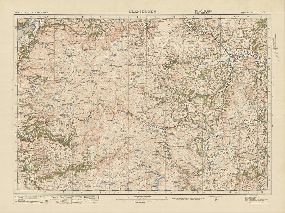 Cette carte ancienne fascinante, intitulée « Feuille 69 - Llanidloes », fait partie de l'édition « populaire » d'un pouce de l'Ordnance Survey pour l'Angleterre et le Pays de Galles, publiée en 1925. La carte présente le comté historique de Montgomeryshire, où se trouve la ville de Llanidloes. situé. Llanidloes, un charmant bourg, constitue le point d'intérêt central sur cette carte. Cependant, ce n’est pas le seul endroit remarquable représenté. La carte présente également plusieurs autres villes et caractéristiques remarquables qui en font une pièce précieuse pour les passionnés d'histoire et les aficionados de cartographie.