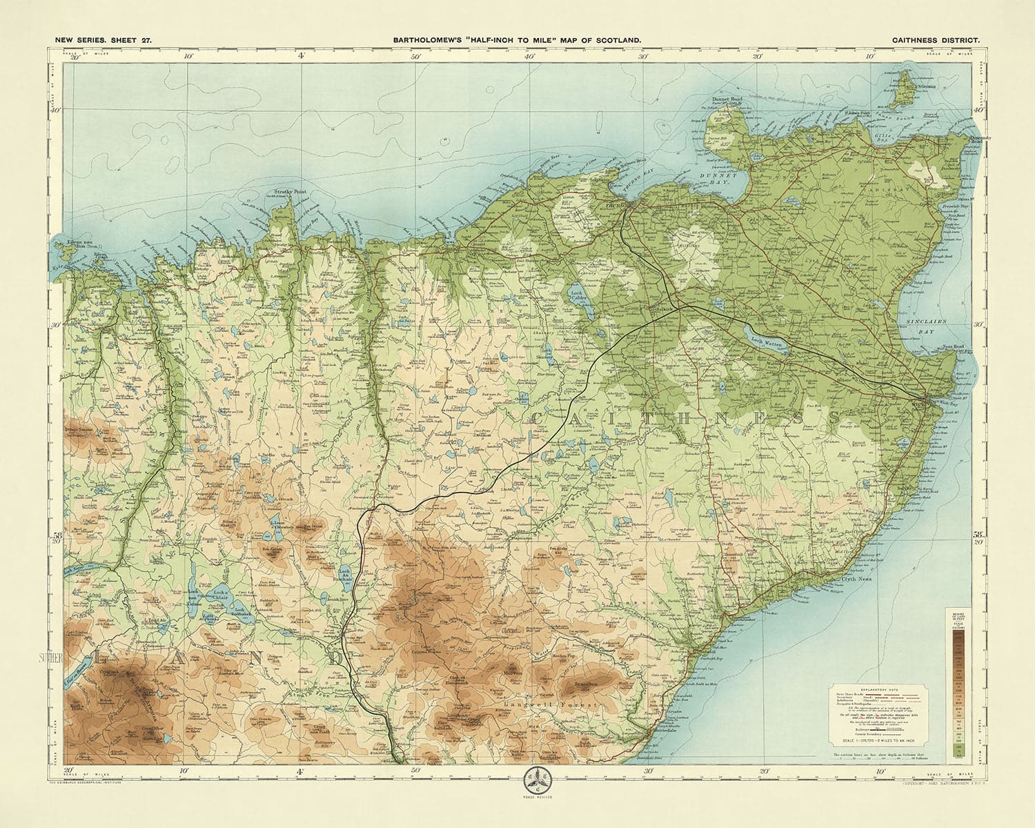 Feuille 27 - Le district de Caithness, conçu par l'estimé JG Bartholomew en 1901, témoigne de l'âge d'or de la cartographie. Cette carte à l'échelle d'un demi-pouce au mile (1:126 720) capture l'essence du district de Caithness en Écosse avec une clarté et des détails inégalés. L'utilisation innovante par Bartholomew de la gradation des couleurs pour représenter le relief du paysage transforme cette carte à la fois en un outil pratique et en une œuvre d'art. Les subtiles couches de couleurs représentent de manière vivante les différentes altitudes, donnant vie à la géographie physique de la région pour les cyclistes, les touristes et les amateurs de cartes.