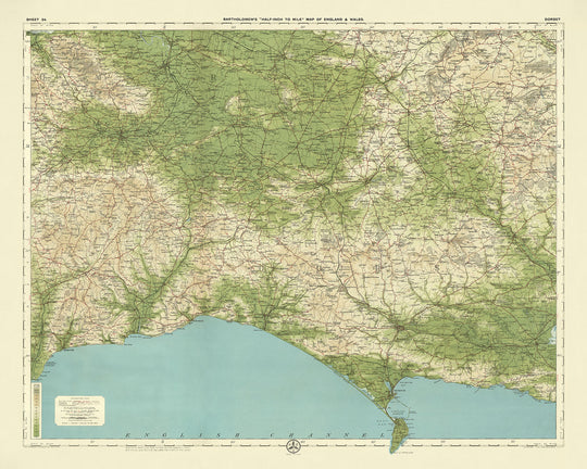 Faites un pas en arrière dans le temps avec l'exquise "Feuille 34 - Dorset," une création magistrale de l'estimé cartographe JG Bartholomew en 1901. Cette carte, faisant partie de la série phare de Bartholomew à demi pouce, offre un aperçu captivant du paysage historique du Dorset, une région du Sud-Ouest de l'Angleterre. Renommé pour son attention méticuleuse aux détails et son flair artistique, le travail de Bartholomew est un témoignage de l'âge d'or de la cartographie. Ses cartes étaient particulièrement appréciées par les cyclistes et les touristes du début du XXe siècle, qui comptaient sur ces guides détaillés pour naviguer dans la pittoresque campagne britannique.