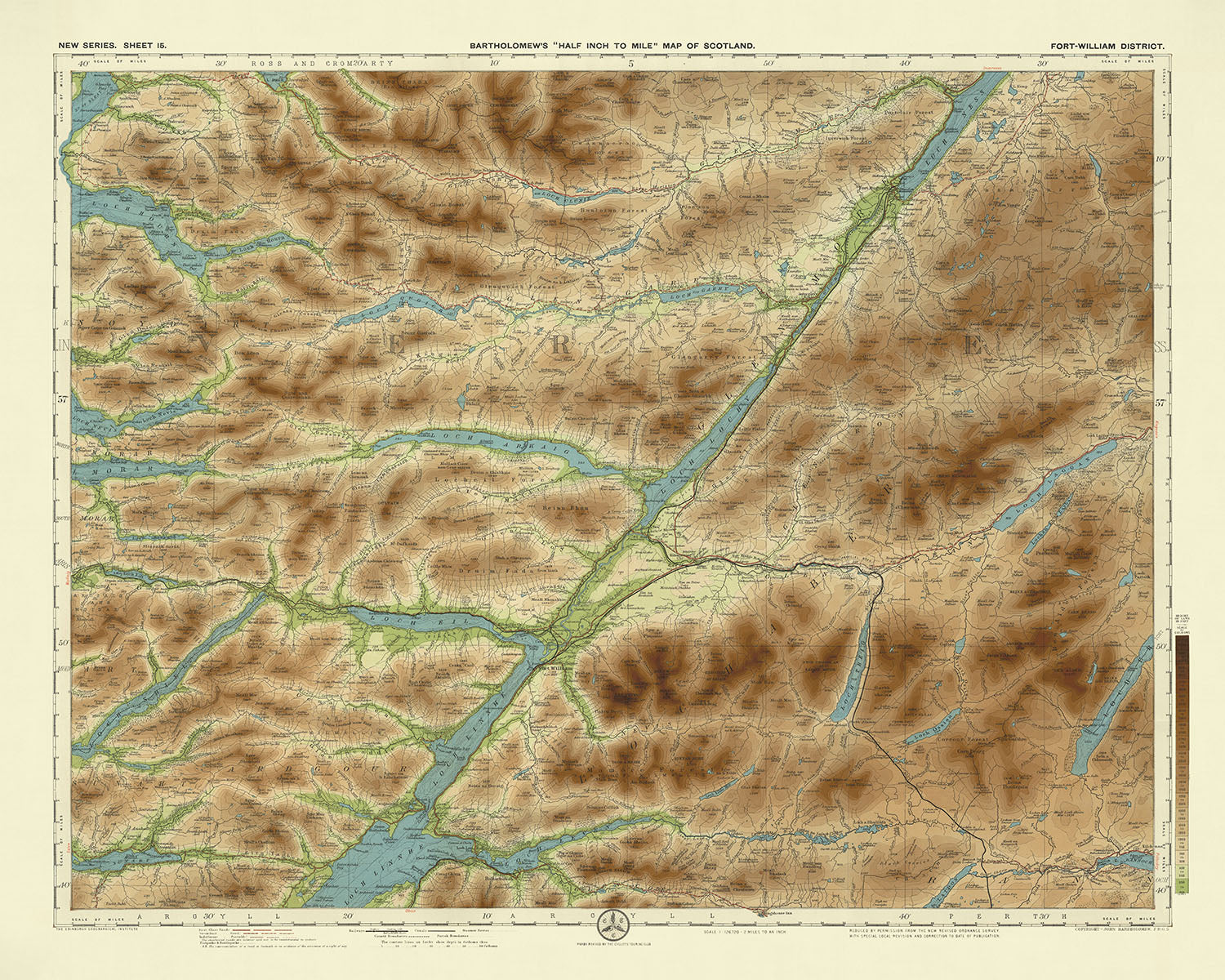 Le design de la carte est une merveille d'innovation cartographique, utilisant des gradations subtiles de couleur pour représenter le relief varié du paysage. Cette technique permet au spectateur de discerner facilement les hauteurs et les profondeurs de la topographie de la région, des sommets majestueux de Ben Nevis et Aonach Mòr aux vallées sereines de Glen Nevis et du Great Glen. L'utilisation soignée de bandes de couleur crée un effet tridimensionnel, donnant vie à la beauté sauvage des Highlands écossais. Cette carte est basée sur une carte d'Ordnance Survey réduite de la même période, garantissant à la fois précision et authenticité historique.