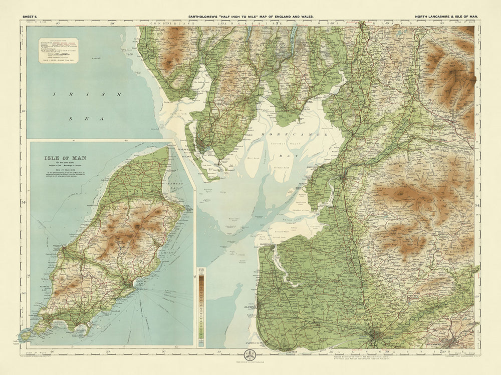 Entrez dans le passé avec l'exquise "Feuille 5 - Lancashire Nord & Île de Man," une création magistrale du cartographe renommé J.G. Bartholomew en 1901. Connu comme "le Prince des Cartographes," le travail de Bartholomew est célébré pour son détail méticuleux et son design innovant. Cette carte, faisant partie de la série phare de Bartholomew, a été réalisée à l'échelle d'un demi-pouce par mile, en faisant un objet prisé par les cyclistes et les touristes du début du 20ème siècle. La carte offre un aperçu captivant de la géographie historique du Lancashire Nord et de l'Île de Man, des régions riches en beauté naturelle et en signification historique.