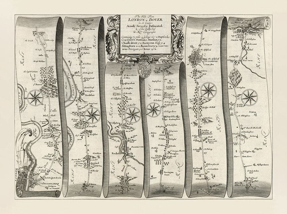 La carte commence à Southwark et se dirige vers le sud-est à travers Blackheath et Dartford puis entre dans le Kent, serpentant à travers Rochester, Sittingbourne, Canterbury et finalement jusqu'à la côte à Douvres. La carte indique que la route faisait 71 miles de long - un peu plus courte que l'itinéraire d'aujourd'hui, qui ferait environ 75 miles. La carte suit à peu près le tracé de la route moderne A2.