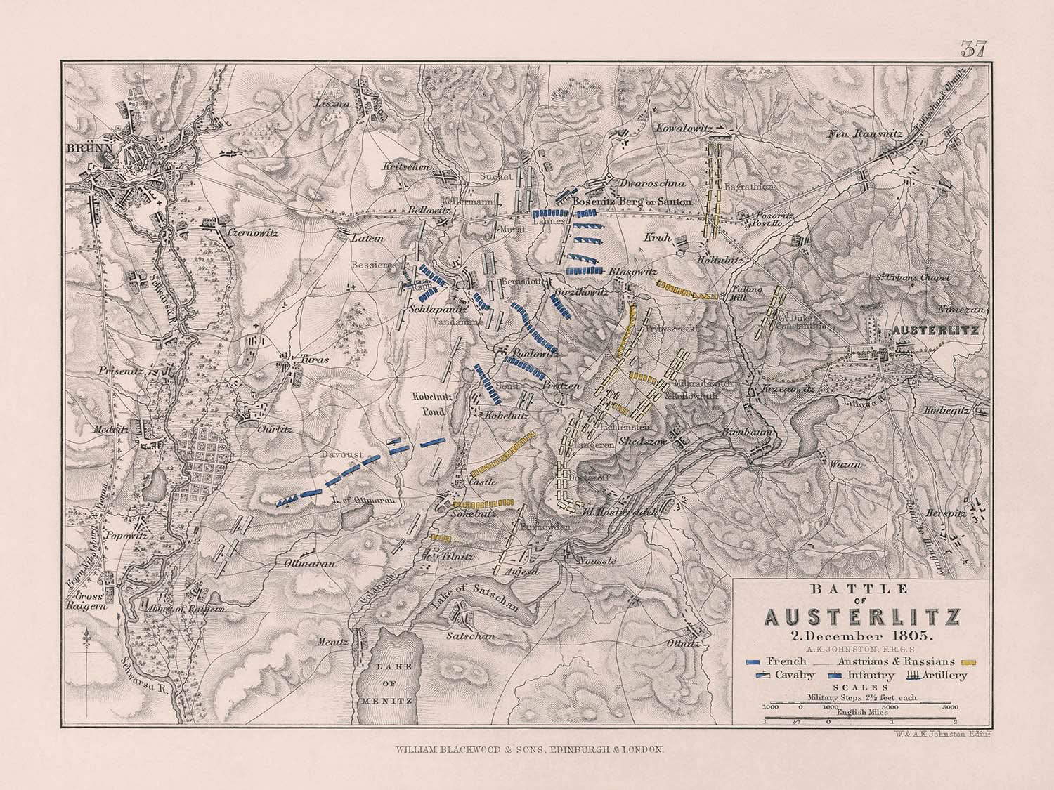 William et Alexander Keith Johnston, célèbres pour leur excellence cartographique, furent chargés de graver cette carte sous la supervision de Sir Archibald Alison pour son « Histoire de l'Europe ». Ce chapitre de l'atlas présente non seulement une vue d'ensemble de l'histoire militaire, mais met également en valeur le talent de Johnston avec des annotations vives et colorées à la main des positions complexes des forces françaises, russes et autrichiennes. Les hachures indiquent élégamment le relief du terrain, contribuant à son utilité et à son charme esthétique.