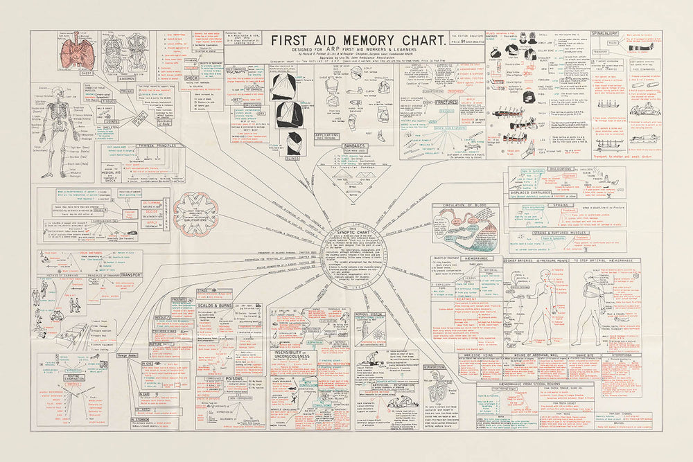 Affiche du cabinet médical : Tableau de mémoire des premiers secours par Harold Palmer, 1939