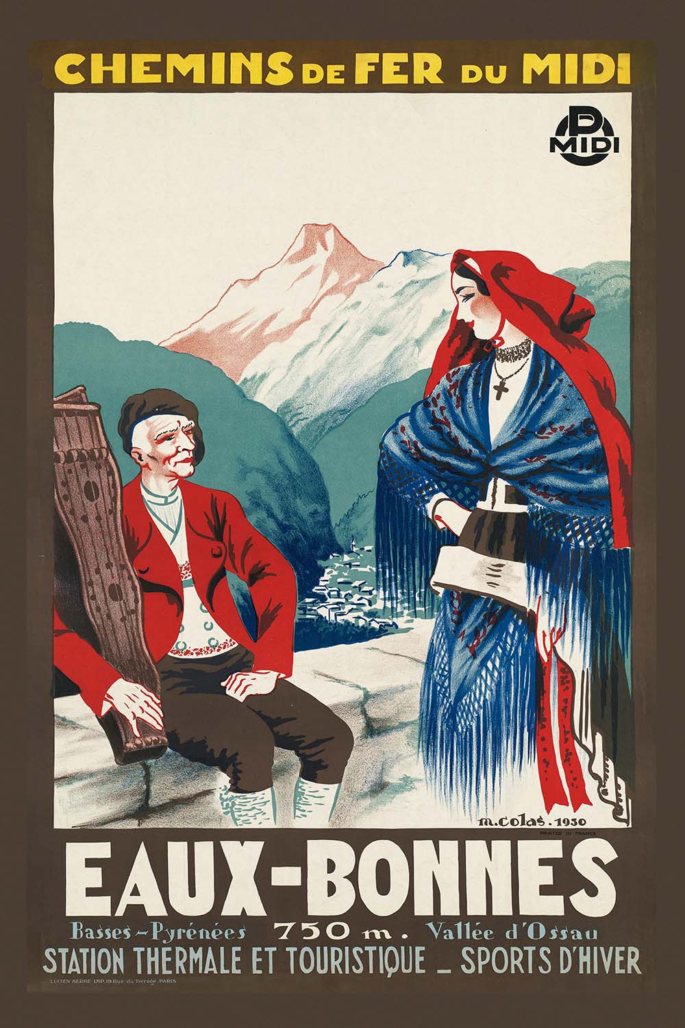 Eaux-Bonnes by M. Colas (1930) is a luminous French railway travel poster celebrating the Pyrenean spa town of Eaux-Bonnes. Created for the Chemins de fer du Midi, it captures the interwar glamour of rail-enabled tourism to the Ossau Valley. In the artwork, a young woman in a blue fringed shawl and red headscarf stands beside a seated figure in a matching red jacket, with wooden skis resting at his side; beyond them, a white village nestles under saw-toothed mountain peaks. At the base, the poster proudly reads “Basses-Pyrénées – 750 m – Vallée d’Ossau” and “Station Thermale et Touristique – Sports d’Hiver,” anchoring the scene to its storied destination.