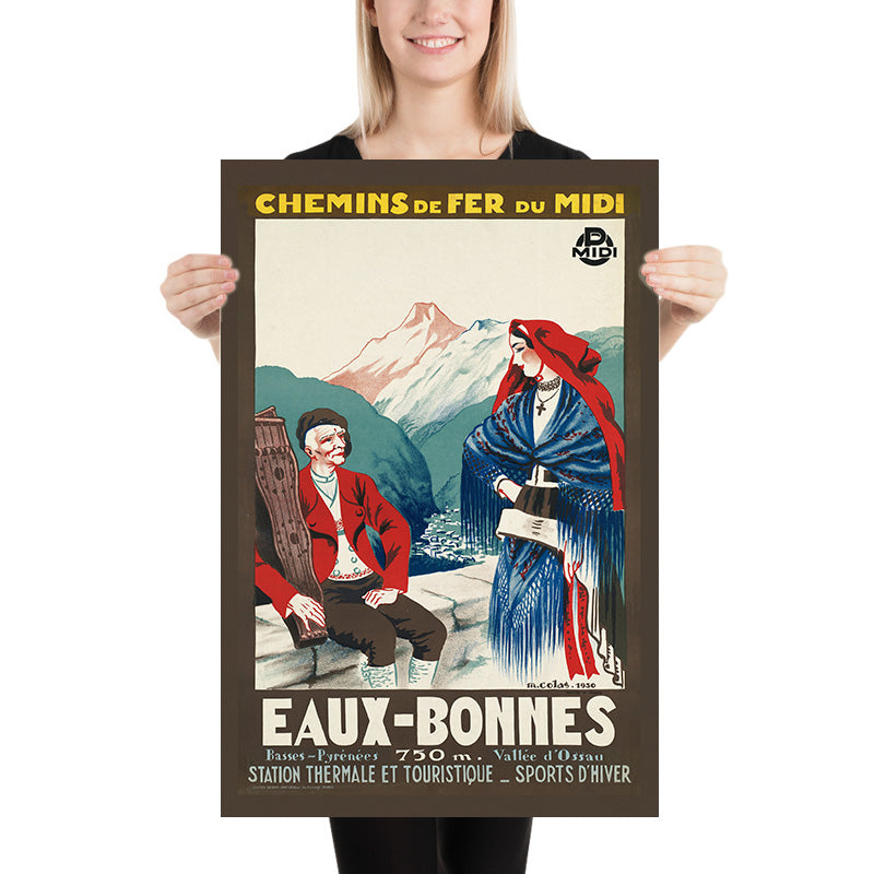 About the place: Eaux-Bonnes is a historic spa resort in the French Pyrenees, celebrated for its thermal waters since the 19th century and a gateway to winter sports in the surrounding Ossau Valley. In 1930, rail travel made these alpine landscapes easy to reach, and the Chemins de fer du Midi promoted them as refined yet adventurous escapes. The printed altitude “750 m” and the promise of “Sports d’Hiver” nod to the era’s growing passion for skiing and fresh mountain air.