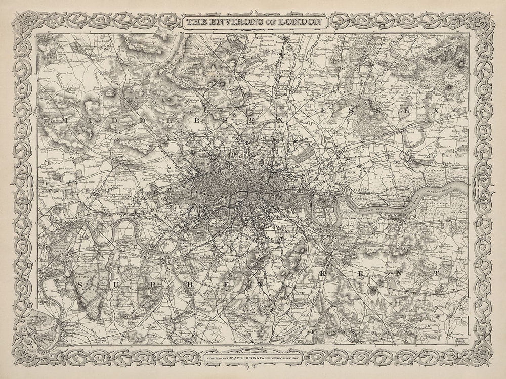 Les Environs de Londres par G.W. Colton en 1886 montrent à quel point Londres était devenu grand à l'apogée de l'Empire britannique. La plupart de ce que nous considérons maintenant comme les arrondissements du centre-ville sont en place - mais les banlieues sont encore des champs et des forêts.