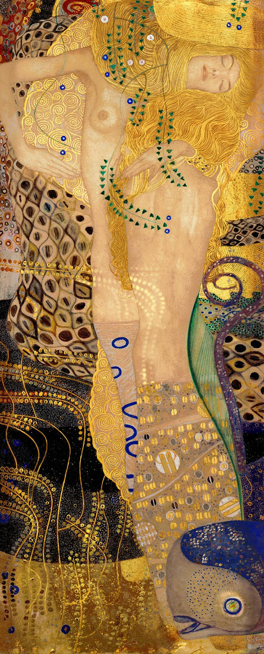 Le "Girlfriends (Serpents d'eau I)" de Gustav Klimt, créé à l'origine en 1904, déploie un monde de mystère et de beauté sensuelle. Klimt, une figure influente du mouvement de la Sécession viennoise, est renommé pour ses peintures éthérées qui mélangent harmonieusement la réalité avec le rêve. Cette œuvre particulière nous transporte dans un royaume enchanteur où des sirènes et des figures serpentine dérivent gracieusement à travers des eaux scintillantes. Fusionnant les éléments de la nature avec la forme humaine, Klimt encapsule la fascination symboliste pour les êtres hybrides, reflétant des mythes tels que celui d'Ulysse et des sirènes ou des contes de néirads et d'Ophelia mélanistique.