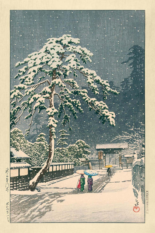 Hasui Kawase était une figure clé dans le renouveau des estampes traditionnelles japonaises au début du 20e siècle, connu pour ses paysages évocateurs. Cette pièce est particulièrement remarquable pour sa représentation magistrale de l'ambiance saisonnière et son exécution technique habile. L'œuvre originale, un charmant instantané de grâce tranquille, utilise habilement une palette centrée sur des blancs et des bleus, infusant la scène d'un attrait apaisant et tranquille—un témoignage du génie de Kawase.