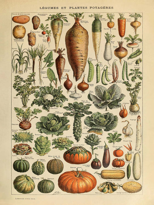 "Légumes" ravit les spectateurs avec une distribution artistiquement arrangée de classiques du jardin potager français. Présentant des membres communs et exotiques de la famille des Fabaceae—tels que les pois (Pisum sativum), les haricots verts (Phaseolus vulgaris), les lentilles (Lens culinaris), ainsi que les fèves (Vicia faba)—cette illustration offre un aperçu complet des légumineuses comestibles, leurs gousses et feuillages représentés avec une précision réaliste remarquable. Chaque plante et gousse est habilement dessinée et ombragée, annotée en cursive raffinée tant pour l'étude botanique que pour le plaisir esthétique. Les illustrations sont baignées de teintes harmonieuses—verts frais, jaunes crémeux des gousses, et touches de violets et bruns doux—créant une composition apaisante mais vibrante adaptée à pratiquement n'importe quelle pièce.