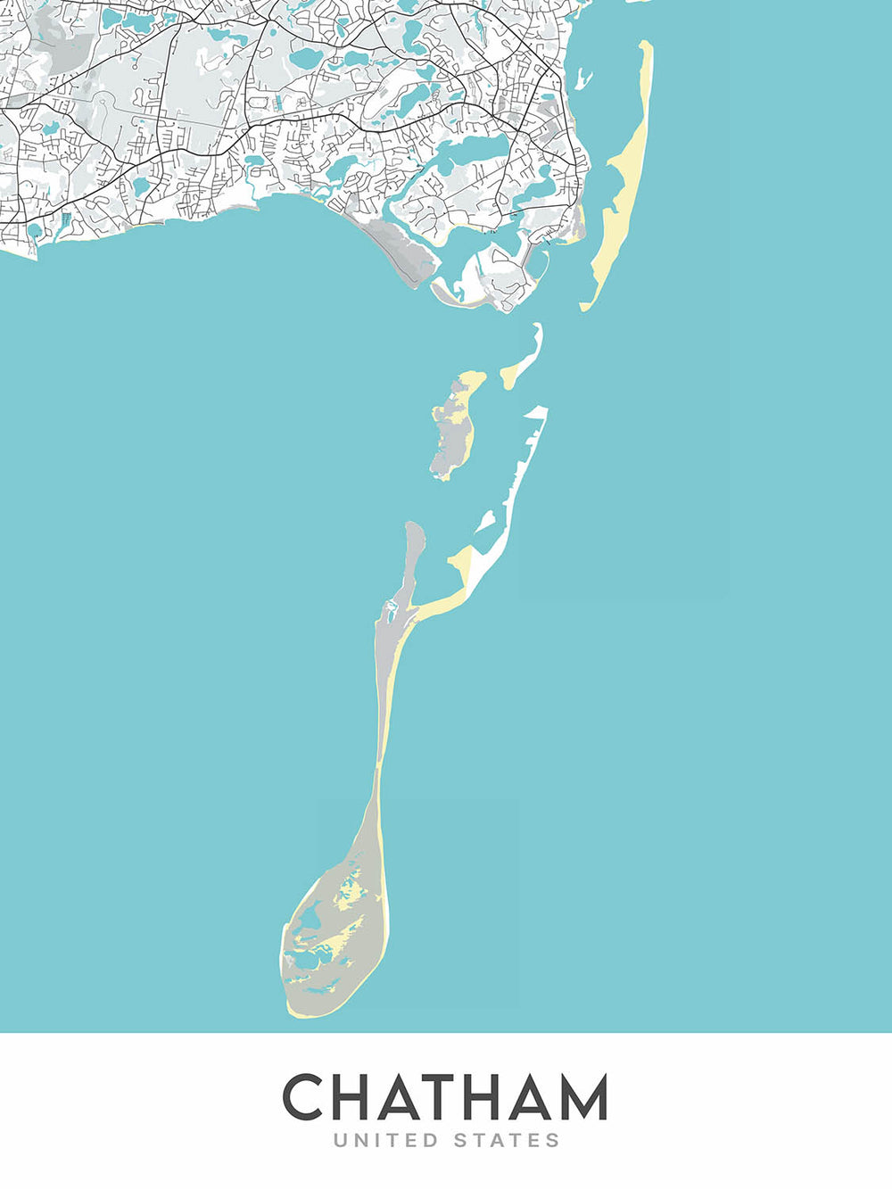 Plan de la ville moderne de Chatham, MA : phare de Chatham, jetée de Chatham Fish, musée du chemin de fer de Chatham, route 28, Pleasant Bay