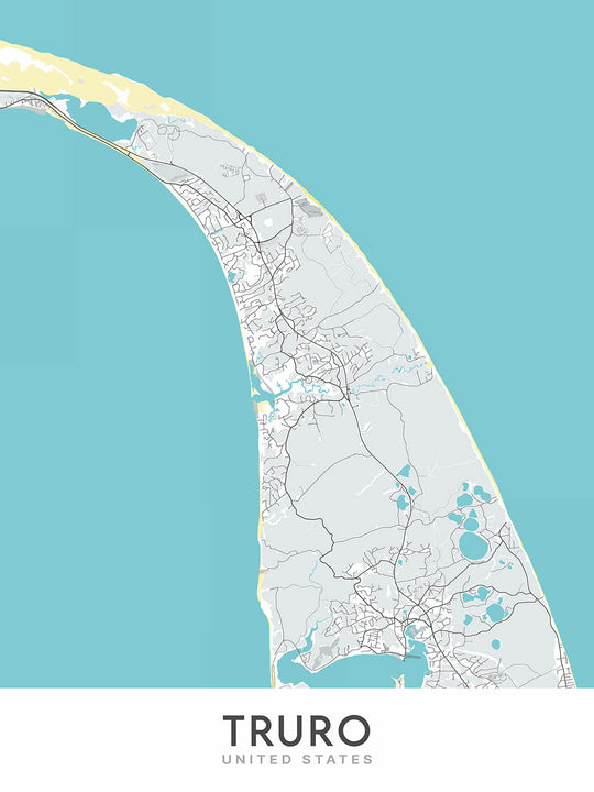 Cette carte de Truro est une carte des rues moderne et détaillée présentant une cartographie unique et un design minimaliste. La carte se concentre sur la ville de Truro dans le Massachusetts et ses environs, offrant une représentation précise et visuellement attrayante de la configuration de la ville. La carte couvre une partie importante de la ville, notamment le centre-ville, les quartiers résidentiels, les zones commerciales et les éléments naturels. Il s’étend également au-delà des limites de la ville pour inclure les villes et points d’intérêt voisins.