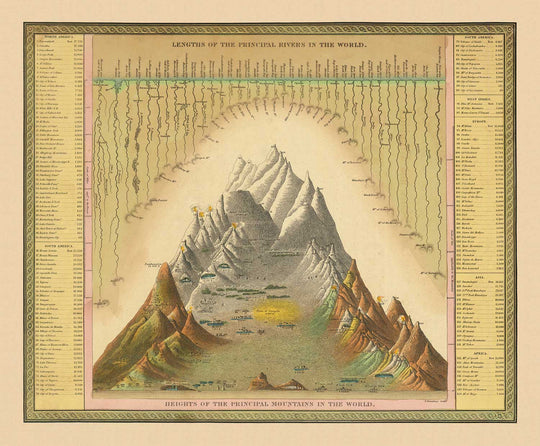Ce tableau comparatif des plus longues rivières et des plus hautes montagnes du monde montre tous les paysages naturels connus à l'époque. Fait intéressant, le Nil n'est pas considéré comme la plus longue rivière au milieu du XIXe siècle, laissant cette place au fleuve Mississippi en Amérique du Nord.