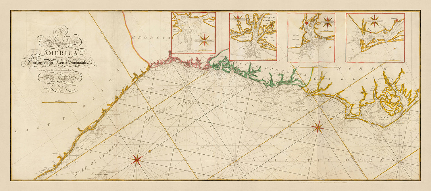 L'un des aspects les plus captivants de cette carte est son encart détaillé des principaux ports tels que la rivière Savannah, Port Royal Sound, Charleston et la rivière Cape Fear. Ces encarts permettent d'observer de plus près les entrées et les voies de navigation de ces ports cruciaux, reflétant l'importance stratégique qu'ils avaient à la fin du XVIIIe siècle. La carte met également en évidence le puissant Gulf Stream, un courant océanique important qui a joué un rôle essentiel dans la navigation transatlantique, soulignant les connaissances et l'expertise avancées du cartographe.