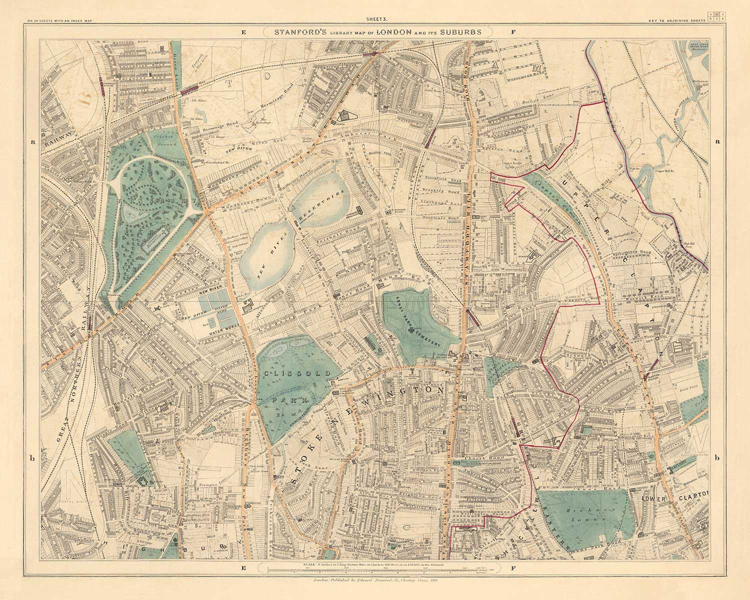 Sur cette carte, vous pouvez clairement voir : Stoke Newington, Upper Clapton, Highbury, Finsbury Park (littéralement le grand parc), Shacklewell, Lower Clapton, Upper Clapton, Hackney Downs, Stamford Hill, Hanger Lane, la rivière Lea, le cimetière d'Abney Park, et bien plus encore.