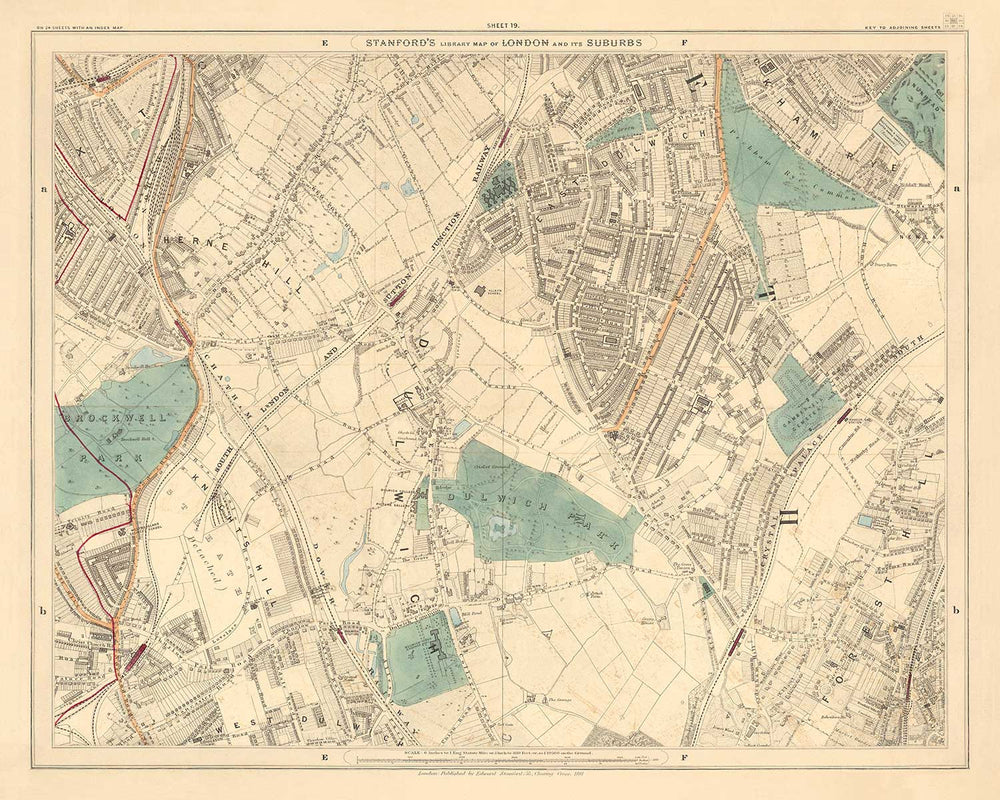 La carte a été publiée à l'origine en 24 feuilles. Au total, la carte mesurait environ 2 mètres de large (78 pouces). Voici la feuille 19, une belle carte qui montre l'une de mes villes préférées dans le sud de Londres : Peckham Rye, East Dulwich, Dulwich, West Dulwich, Forest Hill ET Herne Hill ! (Je sais, incroyable) dans les arrondissements londoniens de Lambeth et Southwark.