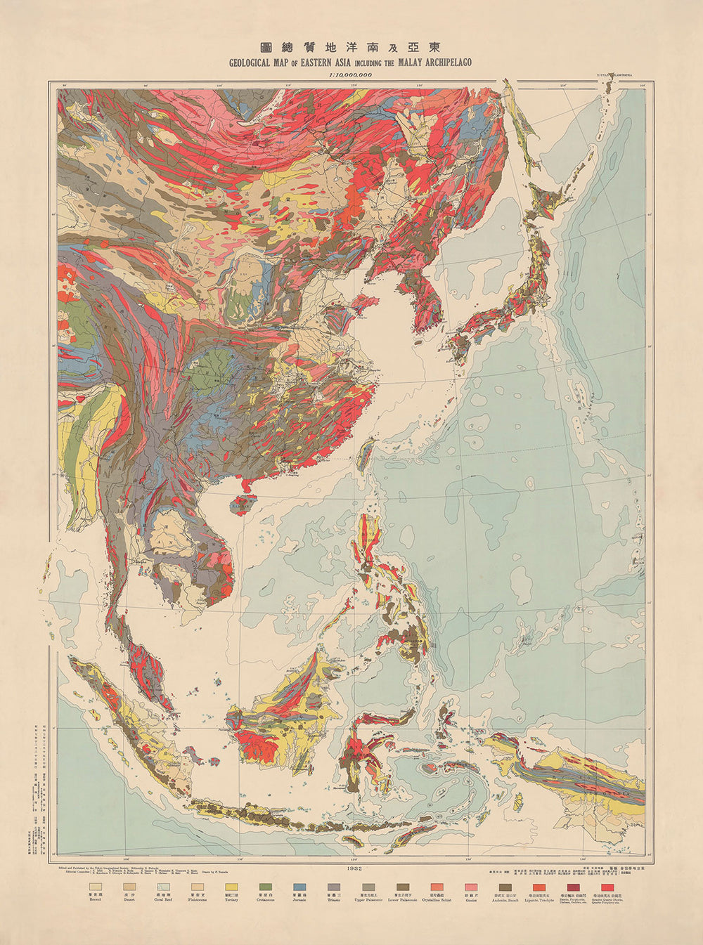 Ancienne carte géologique de l'Asie orientale et de l'archipel malais en 1932 par la Société de géologie de Tokyo: Japon, Chine, Indonésie, Vietnam, Taiwan