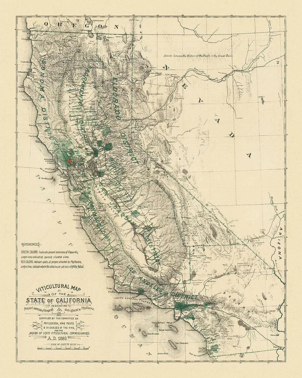 Ancienne carte des vins de Californie, 1880: San Francisco, Los Angeles, Sonoma, vignobles, phylloxéra
