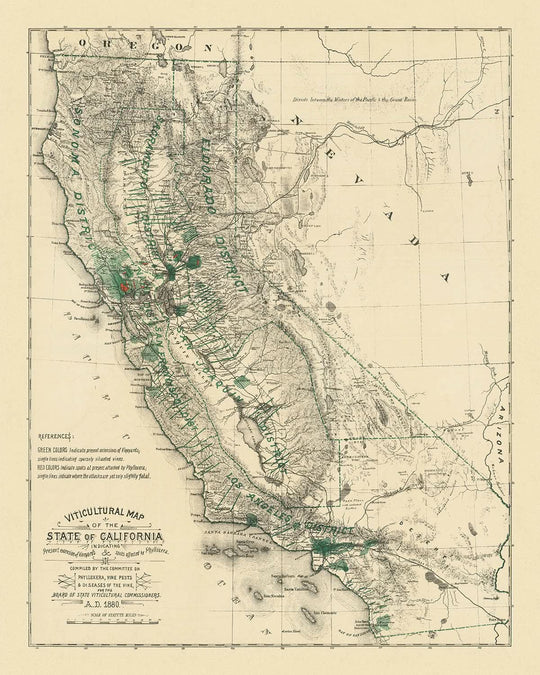 La « Carte viticole de l'État de Californie indiquant l'extension actuelle des vignobles et des zones affectées par le phylloxéra » offre un aperçu captivant de l'industrie viticole florissante de la Californie de la fin du XIXe siècle. Réalisée en 1880 par le Comité sur le phylloxéra, les ravageurs et les maladies de la vigne pour le Conseil des commissaires viticoles de l'État, cette carte est non seulement une réalisation cartographique, mais aussi un document historique d'une importance immense. Elle illustre une période critique où les vignobles californiens étaient en expansion, mais simultanément menacés par le ravageur dévastateur du phylloxéra. La conception thématique de la carte, utilisant des teintes vertes et rouges, illustre de manière vivante les régions de vignobles sains et celles touchées par ce ravageur de la vigne, offrant un aperçu unique des défis auxquels étaient confrontés les premiers viticulteurs.