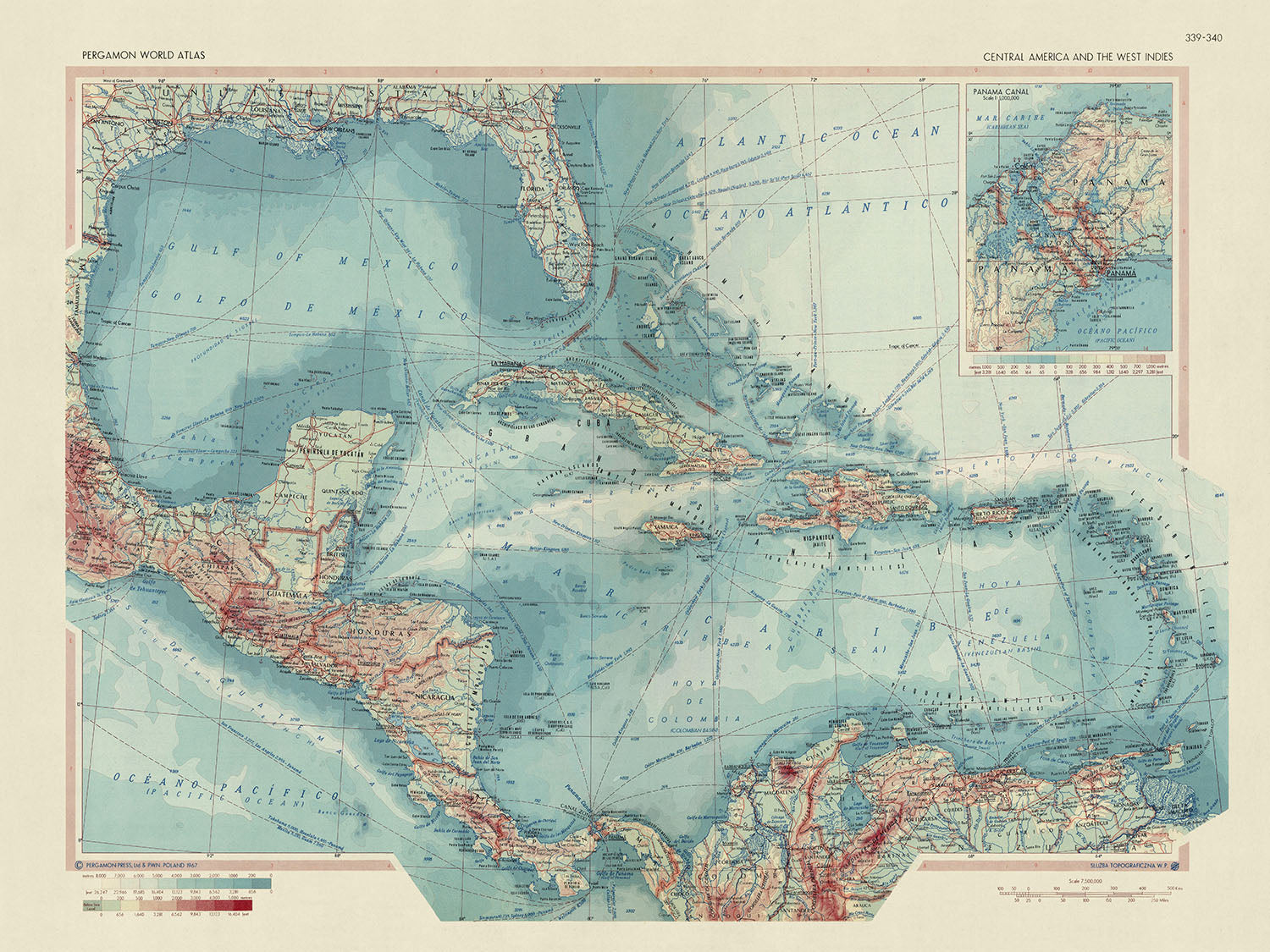 Ancienne carte de l'Amérique centrale et des Antilles, 1967: Canal de Panama, péninsule de Floride, mer des Caraïbes et îles
