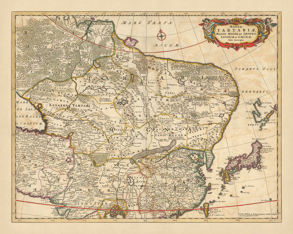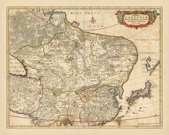 La « Magnae Tartariae, Magni Mogolis Imperii, Japoniae et Chinae nova descriptio » n'est pas seulement une carte, mais un artefact historique qui offre une fenêtre sur le passé. Colorée à la main, la carte gravée comprend un cartouche décoratif et une rose des vents, ajoutant à son attrait esthétique. Le relief représenté graphiquement fournit un effet tridimensionnel, renforçant encore l'impact visuel de la carte.