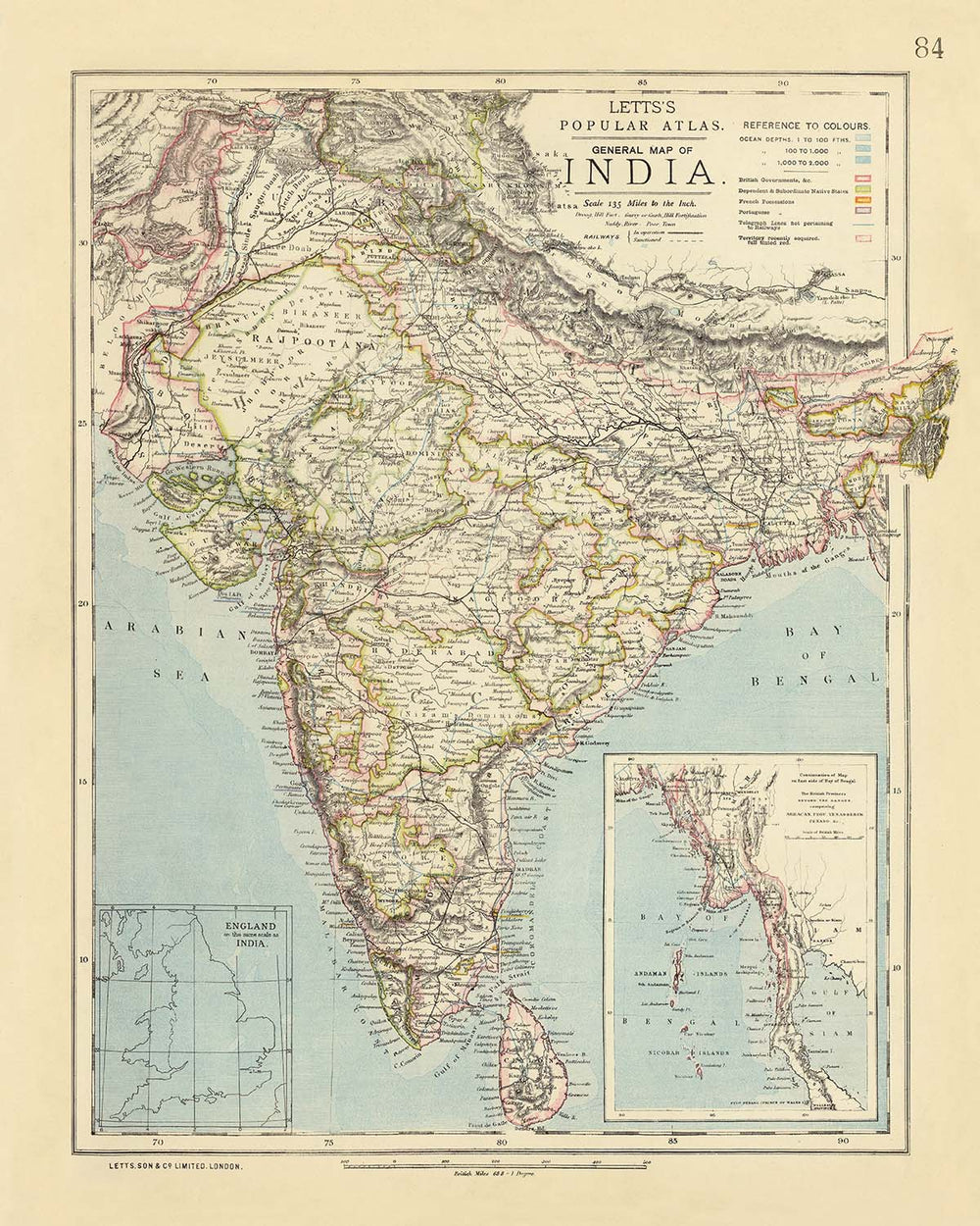 Ancienne carte de l'Inde par Letts, 1883: Calcutta, Bombay, Madras, mer d'Arabie, baie du Bengale