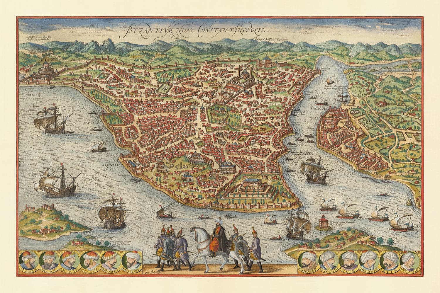 Ancienne carte d'Istanbul, Constantinople en 1572 par Georg Braun: Byzantium, Bosphore, Corne d'or, Palais Topkapi