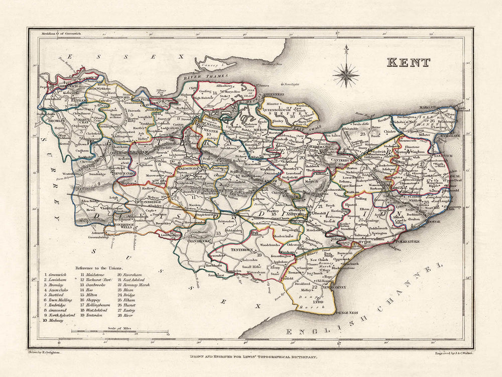 Ancienne carte du Kent par Samuel Lewis, 1844: Maidstone, Gillingham, Ashford, Royal Tunbridge Wells et Margate