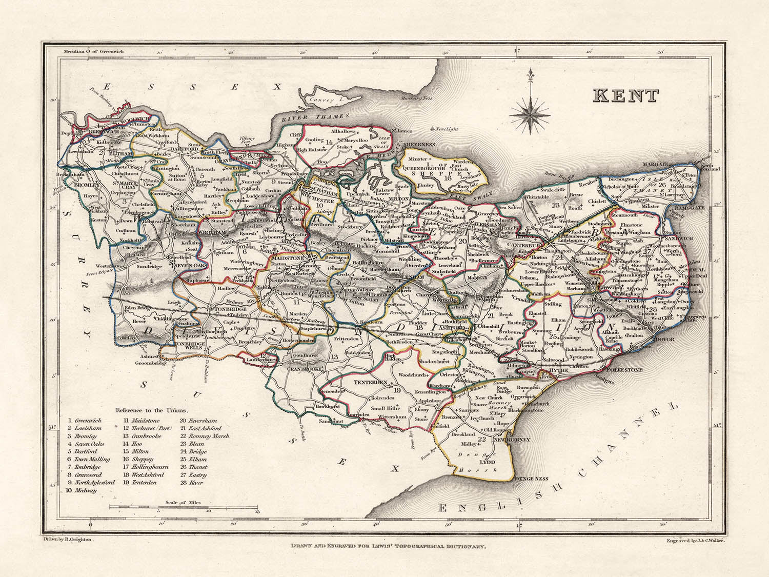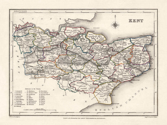 Découvrez la grandeur historique du Kent à travers la carte méticuleusement élaborée par Samuel Lewis en 1844, un trésor à admirer tant pour les passionnés d'histoire que pour les connaisseurs de cartographie. Cette représentation ancienne de l'un des plus vieux et influents comtés d'Angleterre capture l'essence du passé, mettant en valeur des établissements qui précèdent 1840, y compris de nombreuses villes animées d'aujourd'hui. En tant que tel, il dresse un tableau fascinant d'une époque où certaines des villes et bourgades les plus importantes d'aujourd'hui n'étaient qu'en train de se former ou, de manière excitante, étaient connues sous d'autres noms.