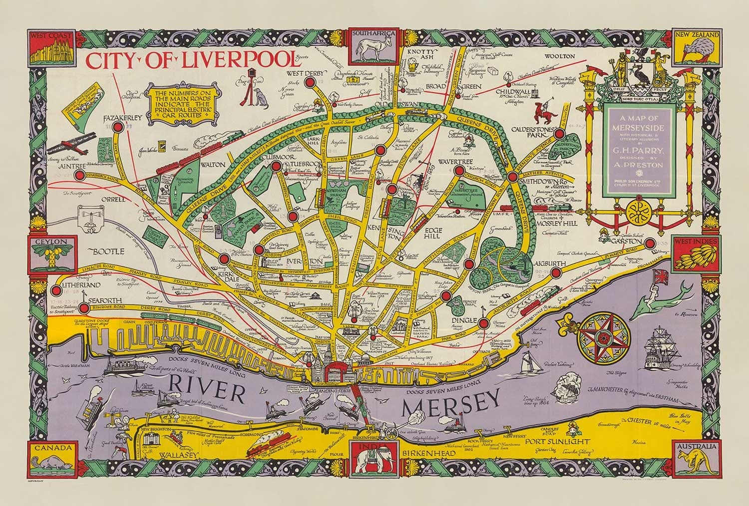 Ancienne carte de Liverpool, 1934 par GH Parry: Tableau de la ville pictoriale