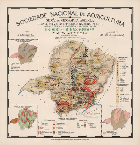 Ancienne carte de Minas Gerais, Brésil en 1908: Agriculture, Géologie, Roches, Sols