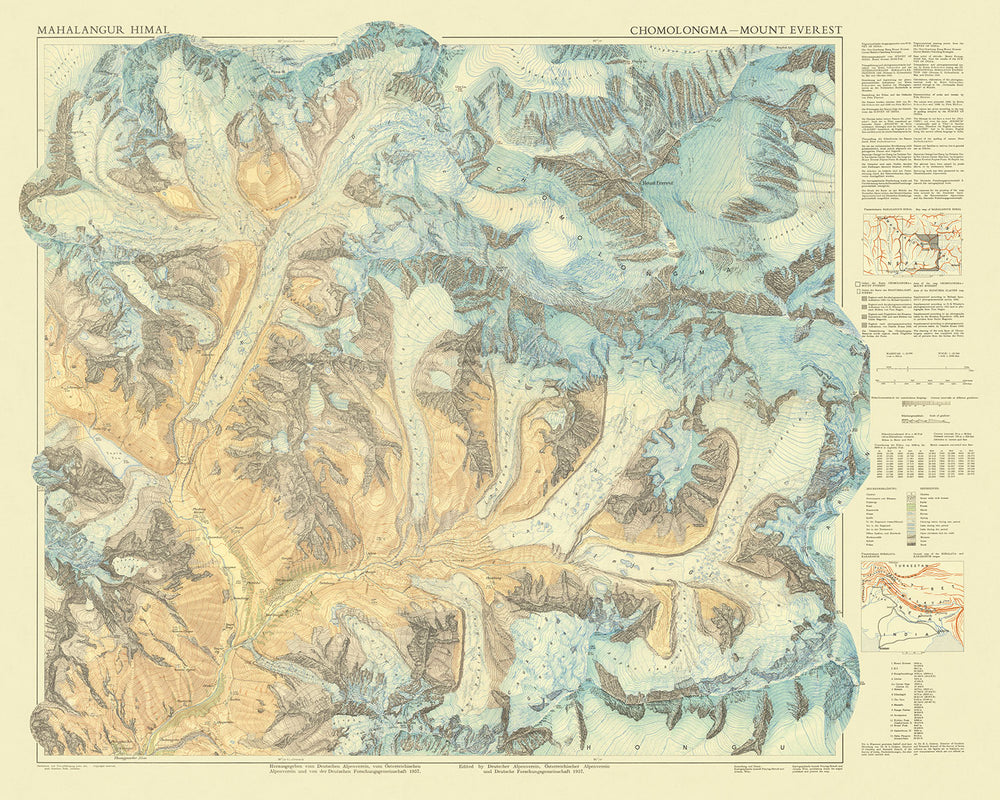 Présentation de la carte Mahalangur Himal : Chomolongma – Mont Everest, un chef-d'œuvre de l'histoire de la cartographie créé par Erwin Hermann Manfred Schneider en 1957. Cette carte est la première à représenter l'intégralité de la région du Mont Everest-Khumbu à une échelle sans précédent de 1:25 000. La carte est née de l'intérêt intense suscité par la première ascension réussie du Mont Everest par Sir Edmund Hillary et Tenzing Norgay en 1953. Le travail de terrain méticuleux de Schneider lors de l'expédition internationale de l'Himalaya de 1955, associé à la finesse artistique de Fritz Ebster, a donné naissance à une carte qui est à la fois un triomphe scientifique et une œuvre d'art.