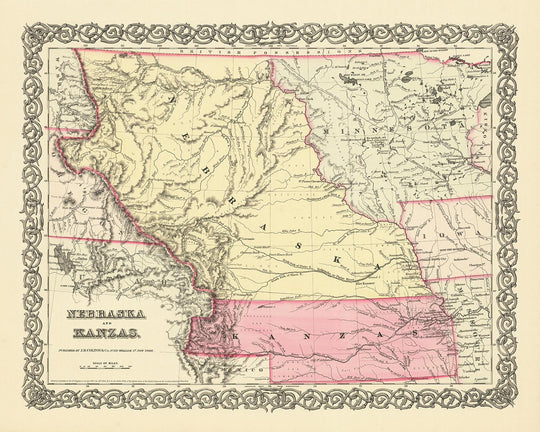 Plongez-vous dans la riche tapisserie de l'histoire américaine avec cette carte ancienne extrêmement détaillée du Nebraska et du Kansas datant de 1856. Fabriquée par le célèbre cartographe JH Colton, largement reconnu comme le meilleur cartographe américain de son époque, cette carte offre un aperçu unique des débuts de l'histoire américaine. jours de ces territoires, à une époque où les États-Unis étaient encore dans leurs années de formation. La carte met en valeur le savoir-faire méticuleux et l'attention portée aux détails qui caractérisent le travail de Colton, et elle témoigne de l'esprit indomptable d'exploration et de découverte qui a défini cette époque.
