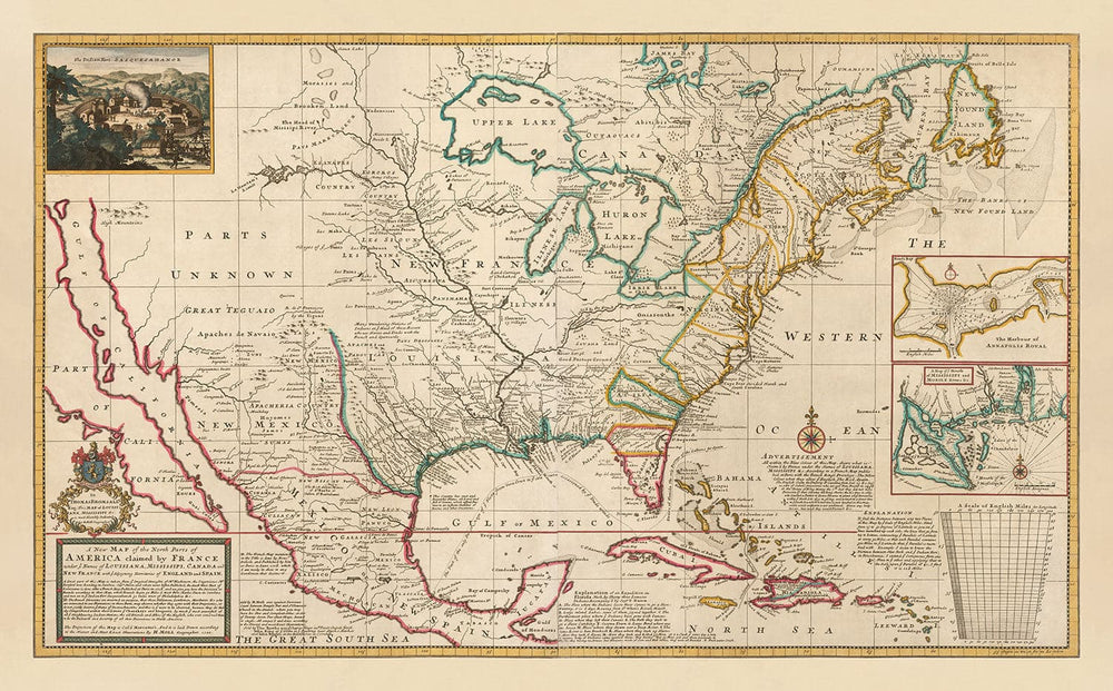 C'est l'une des cartes les plus anciennes et les plus détaillées de l'intérieur de l'Amérique du Nord. Il a été compilé à un point d'histoire intrigant lorsque la plupart du milieu du continent s'appelait Louisiana ou la Nouvelle-France, et le Mexique et la côte ouest ont été revendiqués par l'Espagne. Bien sûr, la côte est a été revendiquée par l'Angleterre!
