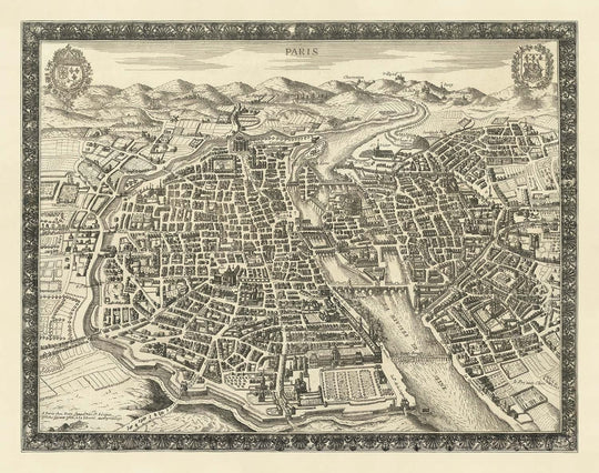 Une carte d'une beauté poignante vue d'oiseau de Paris, publiée par Jean Sauve en 1670. À l'époque, la plupart des plus anciennes parties de la ville étaient déjà construites, mais de nombreux monuments qui rendent Paris célèbre aujourd'hui n'avaient pas encore été construits.