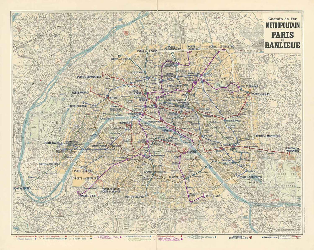 Plan ancien du métro et des monuments de Paris, 1934 par Gaillac-Monrocq: 13 lignes, Arc de Triomphe, plan touristique de la ville du 20ème siècle