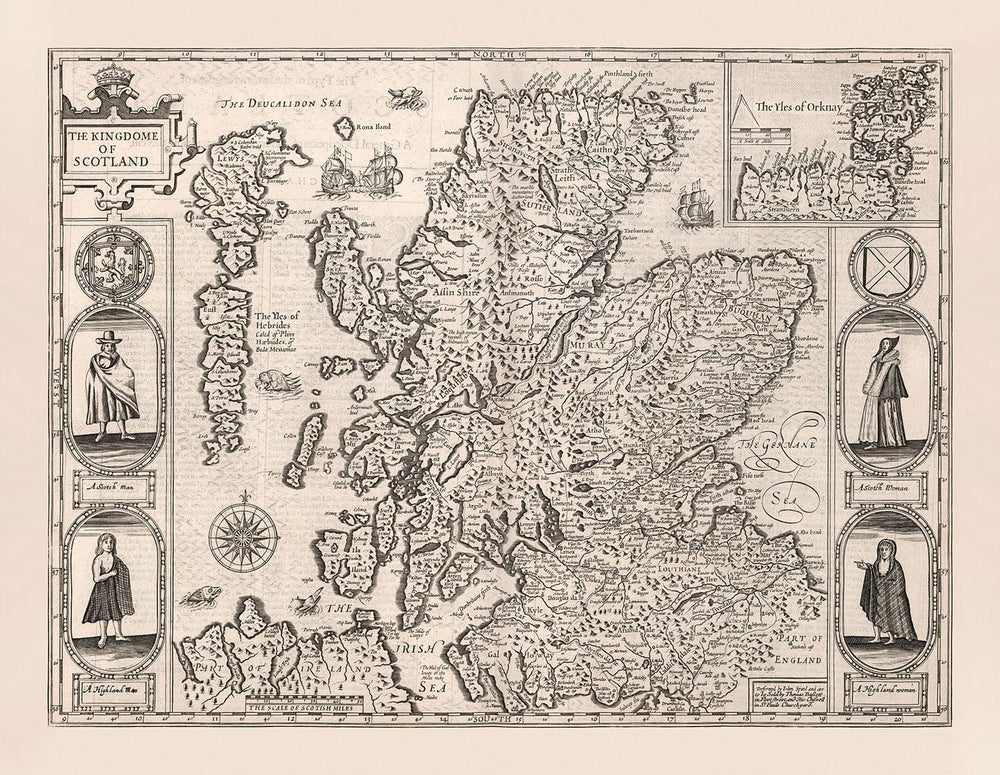 De nombreuses villes, villages et cités d'Écosse sont déjà visibles sur cette carte. En haut à droite, il y a une gravure en incrustation des îles Orcades. Sont incluses des gravures de divers royaux, comme le roi Jacques de Grande-Bretagne, de France et d'Irlande, la reine Anne et le prince Henry. Une version ultérieure de la carte verrait les royaux remplacés par des roturiers. Les îles Shetland, les Hébrides, Skye, le Loch Ness, le Loch Lomond, le Mull of Kintyre... ils sont tous ici.