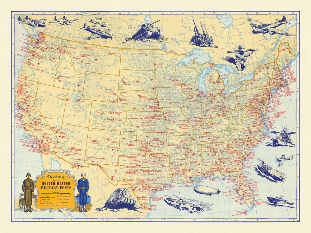 Ancienne carte militaire des États-Unis par Rand McNally, 1944: Seconde Guerre mondiale, aérodromes, bases navales et militaires