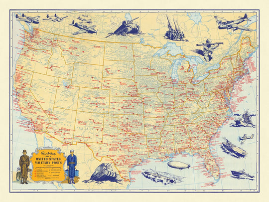 Cette carte thématique est une riche tapisserie de symboles, chacun représentant des aérodromes, des bases navales et des camps militaires, fournissant un aperçu détaillé du paysage militaire. Le design de la carte est à la fois fonctionnel et artistique, avec des illustrations d'avions militaires et de personnel, qui ajoutent un élément visuel dynamique. Le verso de la carte comprend des silhouettes de 20 différents avions militaires américains, offrant un aperçu fascinant de la technologie aéronautique de l'époque. Elle liste également les taux de salaire mensuels pour les officiers et le personnel enrôlé, reflétant les aspects économiques de la vie militaire.