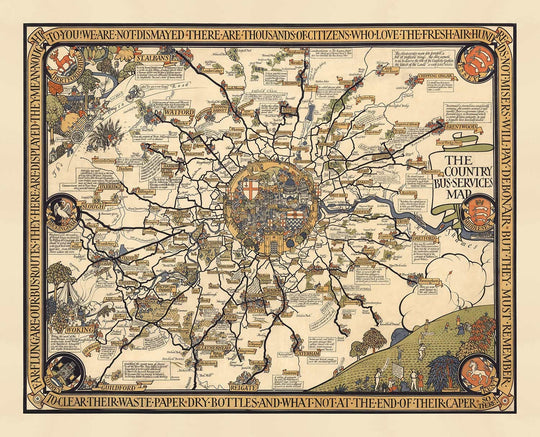Cette carte magnifique et absolument unique de Londres de 1928, créée par le maître cartographe pictural Macdonald (Max) Gill, montre les "routes de bus éloignées" de Londres vers les comtés environnants - Kent, Surrey, Buckinghamshire, Hertfordshire, Essex et Middlesex.