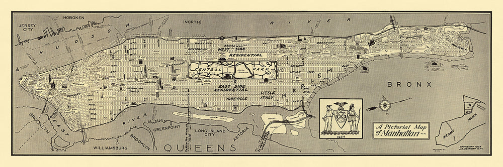Le cartographe IS Seidman était réputé pour sa capacité à combiner des éléments thématiques avec une cartographie précise. Son travail sur cette carte ne fait pas exception, mettant en valeur le réseau complexe de rues et d'avenues de Manhattan. L'attention portée aux détails par Seidman est évidente dans l'étiquetage minutieux de toutes les rues et des principaux monuments, faisant de cette carte non seulement une belle œuvre d'art mais aussi un document historique précieux. L'inclusion de structures emblématiques comme l'Empire State Building et la Statue de la Liberté ajoute une couche de profondeur et de signification à la carte.