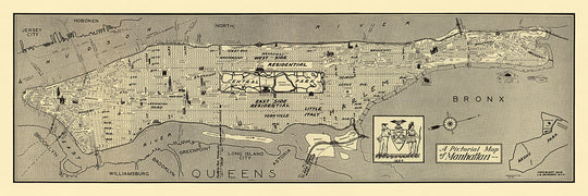 La représentation sur la carte des rivières de Manhattan et de ses environs ajoute une autre couche de contexte historique. Les rivières Hudson et East River sont clairement indiquées, ainsi que les régions voisines comme Jersey City, Hoboken, Brooklyn et Queens. Cette vue globale de Manhattan et de ses environs permet de mieux comprendre l'importance géographique et culturelle de la ville. « Une carte illustrée de Manhattan » n'est pas seulement une carte ; c'est un artefact historique qui capture l'esprit et l'essence de la ville de New York à la fin des années 1930.