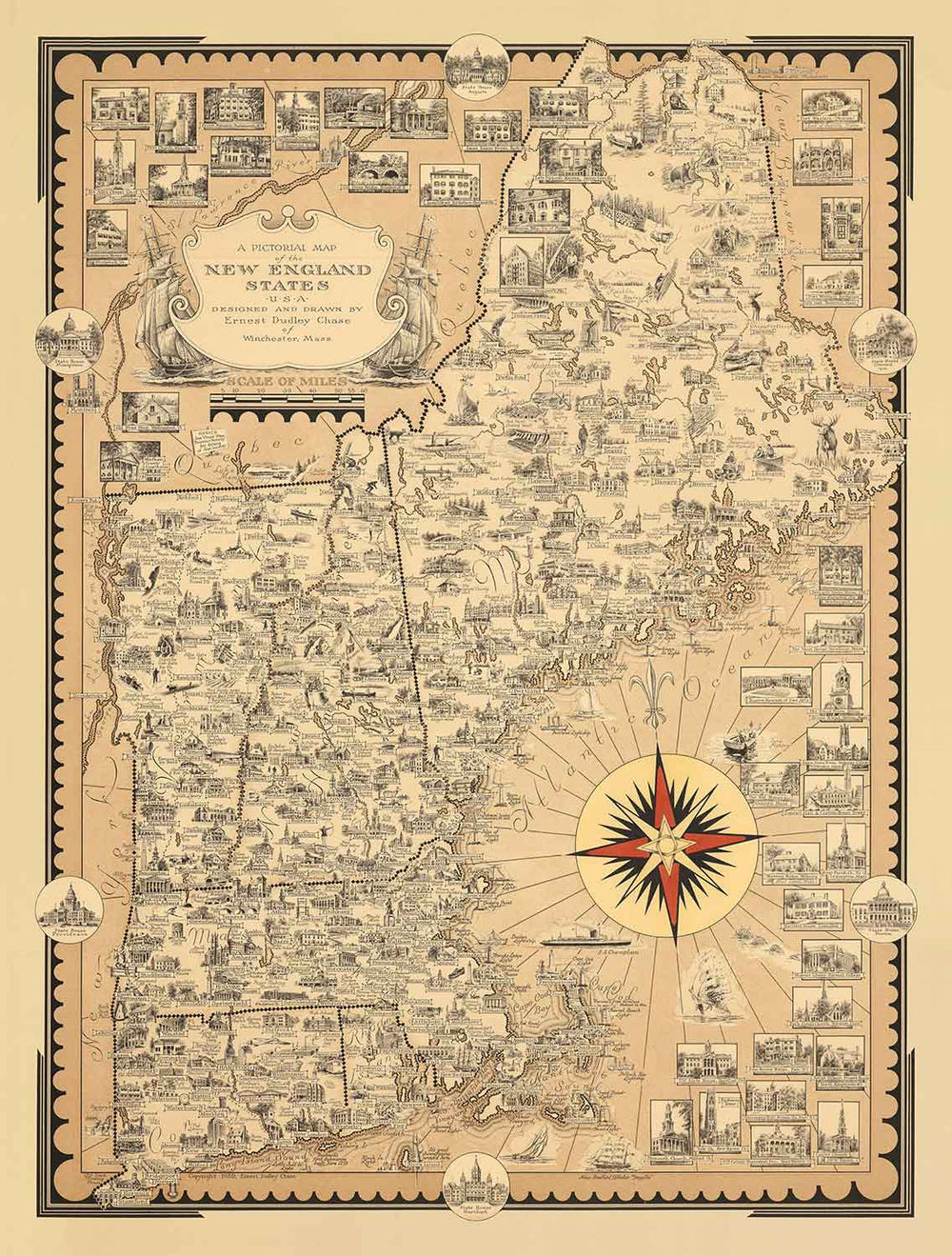 Ancienne carte picturale de la Nouvelle-Angleterre, États-Unis, 1939 par Ernest Dudley Chase: Maine, Vermont, New Hampshire, Massachusetts, Connecticut, Rhode Island