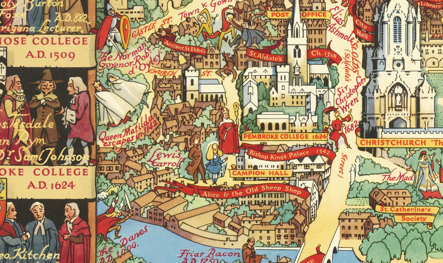 Cela inclut : La Cloche, St. Peter-in-the-East, l'Université d'Oxford (Universitas Oxon), St Catherine's, Keble, All Souls, Trinity, Corpus Christi, Worcester College, Lincoln College, Pembroke College et New College. Il y en a beaucoup d'autres visibles sur la carte, y compris les emblèmes des collèges et de l'université. Chaque collège est montré ici - sauf pour les plus récents qui ont été fondés depuis 1948.