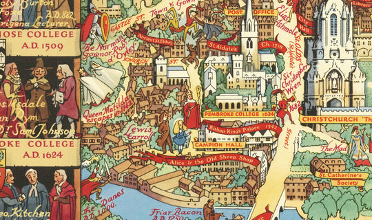 Une magnifique carte picturale d'Oxford, se concentrant sur le centre-ville et les collèges universitaires qui s'y trouvent. La carte a été publiée à l'origine en 1948 par Kerry Lee.